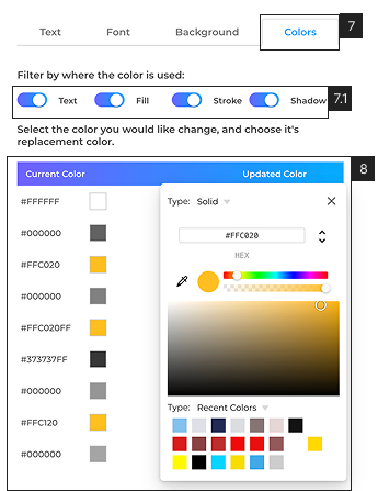 - Colors 7.1 Select from where you want to replace the colors from [Text, Fill, Stroke, Shadow]