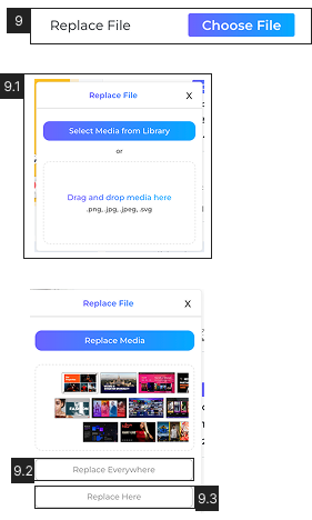 9.1 From the pop-up either choose a media file from the ‘Media Library’ or drag and drop a new file from the desktop.9.2 Choose to replace the media on all slides with ‘Replace Everywhere’
